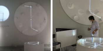 鏡とプリズムを活用して、大きな丸いキャンパスにサイエンスアート的な光の幾何学模様を映し出す展示で、コンピューターによってコントールされている(図2左正面)。