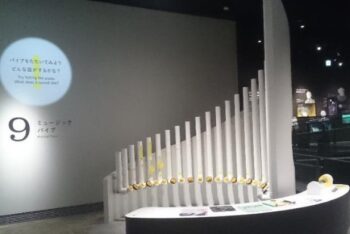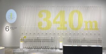 この展示物も、大型展示物とハンズオン実験を一体化したものとした。学校では、 15℃のときの空気中の音速を340m/sと習うが、このことを実感してもらう実験展示物である。340mパイプを通ってきた音は約1秒遅れて聞こえる。