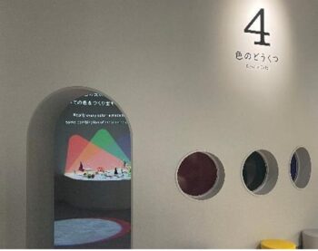 ここでは大型展示物とハンズオン実験を一体化させた。大きな洞窟のような部屋のなかで、光の三原色の実験のプログラムが、一定の時間間隔で自動再生される。例えば、加色混合の演出や赤い光のみの部屋や緑の光のみや青の光のみの部屋になったときに、いろいろな色をした置物が、何色にみえるかを実体験してもらうなどが設定されている。