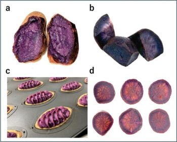 a:焼きいも、 b:ダイスカット、 c:紅芋タルト、 d:チップス (提供:農研機構)