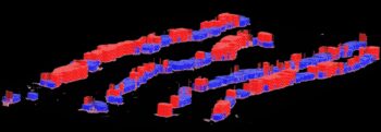 生検検体の3次元再構成データ上に、病理プロファイルの基となるAIが抽出した100種類の病理学的特徴の分布を可視化したものである。各パッチに対して全摘検体から学習した特徴表現を適用し、「どの特徴が何%含まれるか」が赤と青の色分布(赤は高リスク、青は低リスク)とその高低(リスクの値)として示されている。これにより、生検検体という小さな標本内でも、腫瘍の異質性や微小な病理的パターンが空間的にどのように存在しているかを直観的に把握でき、中間推論スコアの基盤となる特徴の空間的広がりを視覚的に理解できる。(提供:理化学研究所)