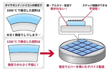 600℃近辺までは、シリコンの方がダイヤモンドより大きく膨張するが、600℃を超えると両材料の熱膨張の差は小さくなっていき、1,200℃で接合すると反りの違いによる基板間の高低差が9µm (マイクロメートル、ここでは1,000分の9mm )にまで低減し、ダイヤモンド・シリコン複合ウエハーの開発に成功した。