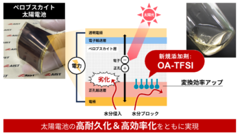 これらの効果により、ペロブスカイト太陽電池の変換効率が向上、また、高い耐久性が得られるという。ペロブスカイト太陽電池の実用化開発の加速が期待されるとしている。