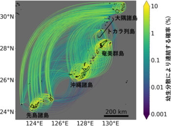 その結果、南端の先島諸島(西表島、石垣島、宮古島など)から沖縄諸島、奄美群島、トカラ列島、そして北端の大隅諸島(種子島、屋久島など)までの約1,000kmにわたり、遺伝的には大きく相違していないことが分かった。幼生分散のシミュレーションからも多くの幼生が遠距離まで供給されており、さらに奄美群島からは黒潮に逆行する時計回りの小規模な流れの影響で沖縄諸島へ幼生が供給されていた。【図2】